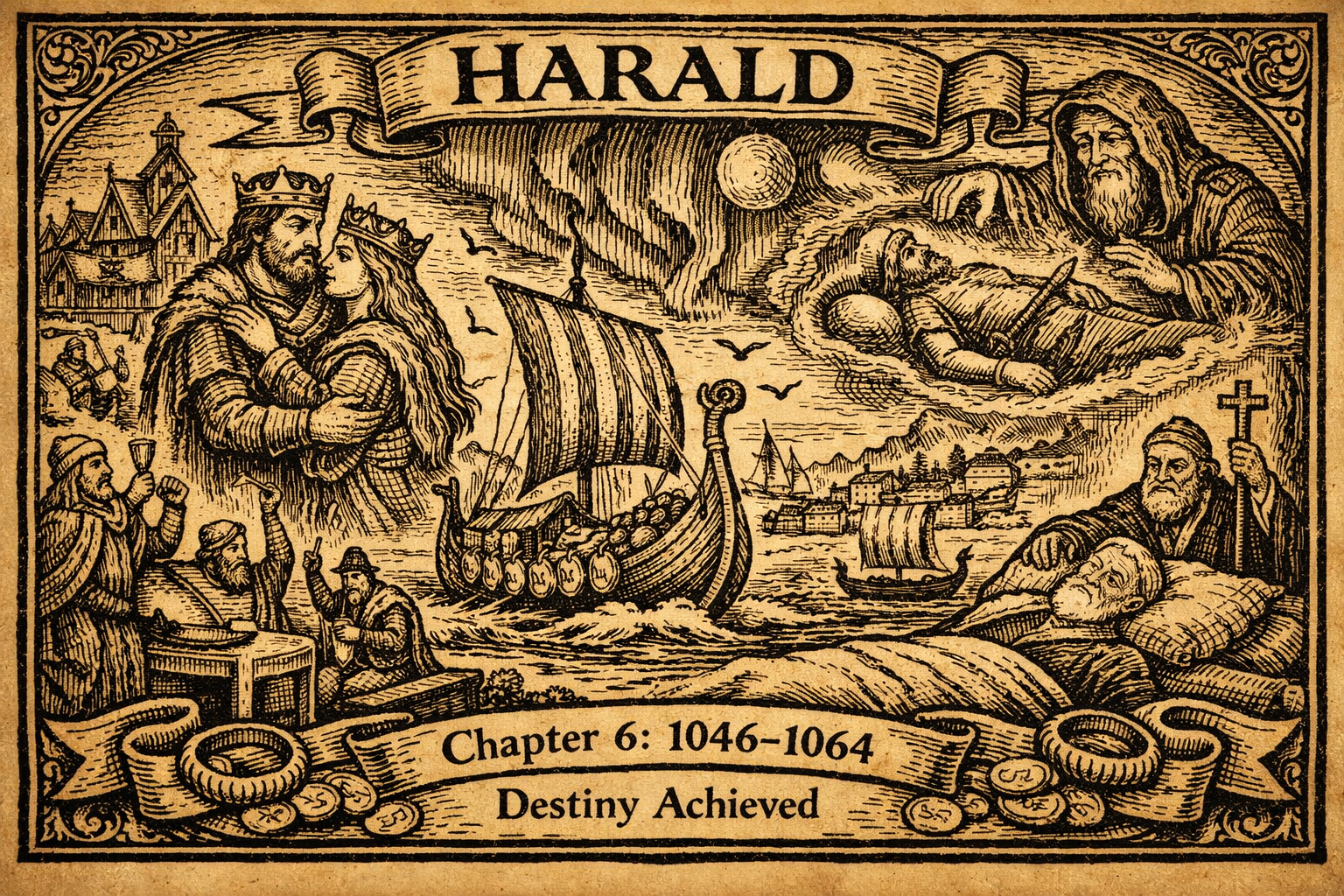 In the clear nights of the north, the sky sometimes burned with wavering light—green and pale, like banners of ghostly cloth. Men called it the northern lights, and some muttered that it was Odin riding with the Wild Hunt, or that it was the dead feasting in the heavens. Harald stood often outside in those nights, looking out over the fjord where his ships lay. A king can never fully sleep. Even when the hall is warm, his mind goes out like a prow into dark water.