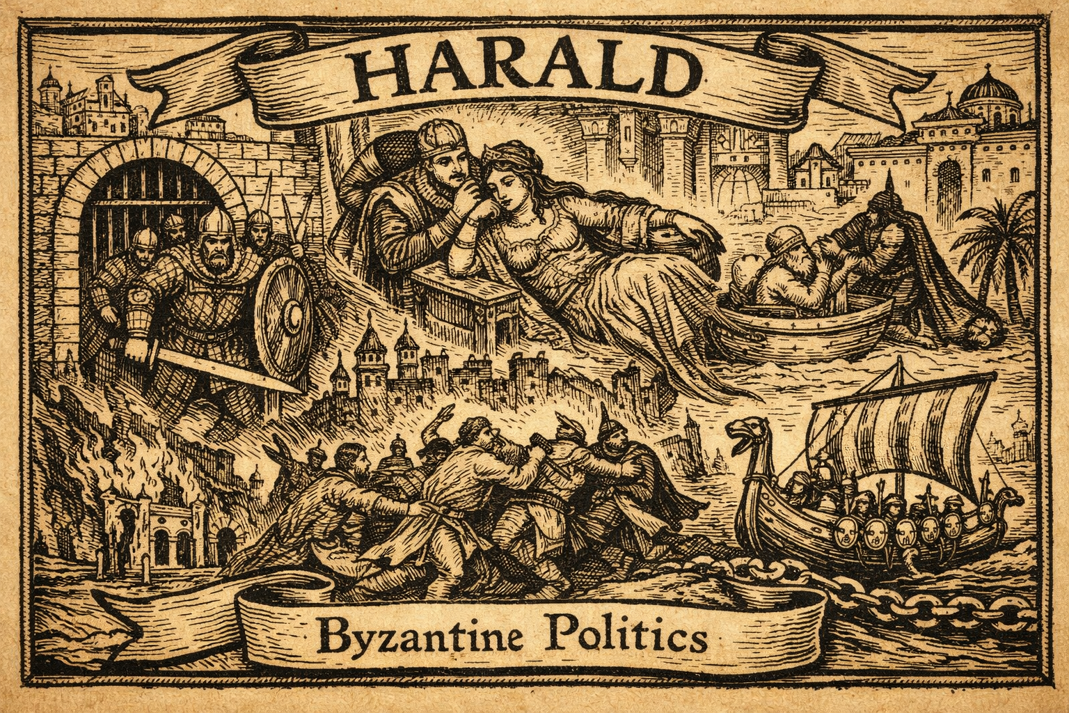 Máría was the name of a beautiful young maiden. She was the daughter of Queen Zóë’s brother. Harald had asked for the hand of this maiden, but the queen had forbidden it. According to Varangians who had served as soldiers in Miklagarth and returned to Iceland, it was said by well-informed men there that Queen Zóë herself wished to marry Harald and that this was the chief reason for her accusation of Harald when he desired to leave Miklagarth, though the people were given another reason. At that time Konstantínus Mónomákús1 was the king of the Greeks. He ruled together with Queen Zóë. For the reasons alleged, the king of Greece had Harald taken prisoner and put into a dungeon.